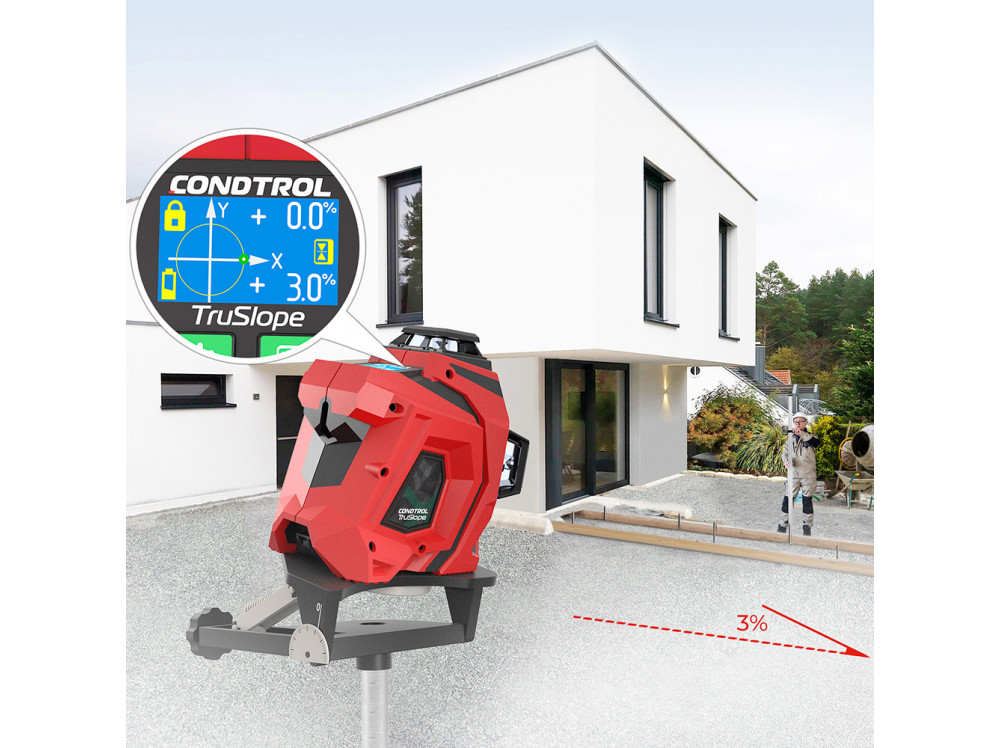 Лазерный нивелир TruSlope CONDTROL предназначен для построения наклонных плоскостей с точным проектным углом наклона. Прибор оснащён OLED-дисплеем и датчиком угла наклона маятника, что позволяет построить горизонтальную наклонную плоскость по заданным параметрам.